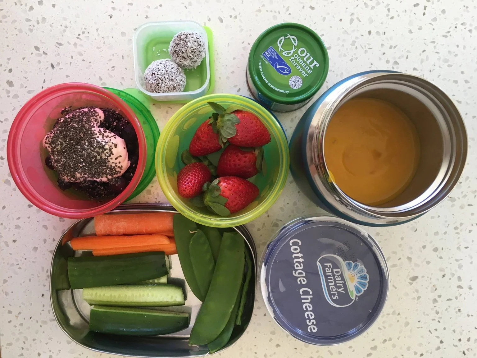 This random looking photo is what I packed in my lunch bag today which I make at the same time as Eadie’s (my toddler who goes to family day care when I’m in the clinic). Hers is identical.